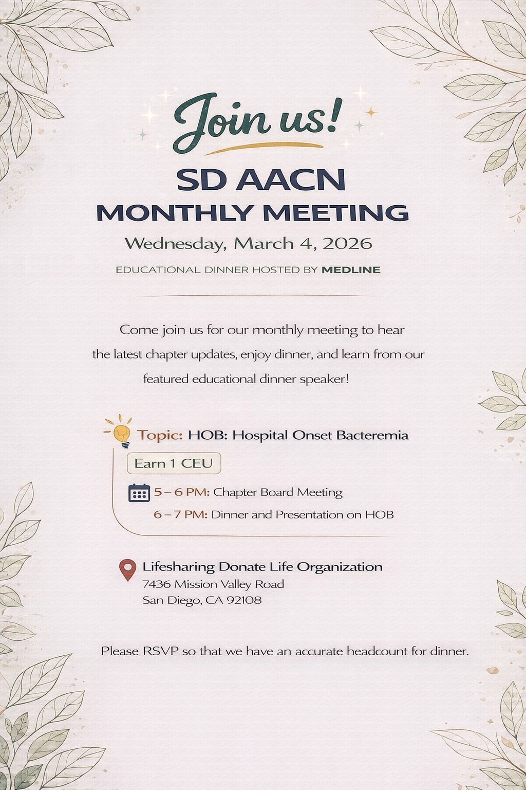 Please join the SDAACN for our monthly meeting, followed by an educational dinner hosted by Medline